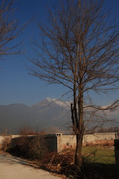 枯樹襯托著藍天和玉龍雪山當背景,似乎也蠻協調的!