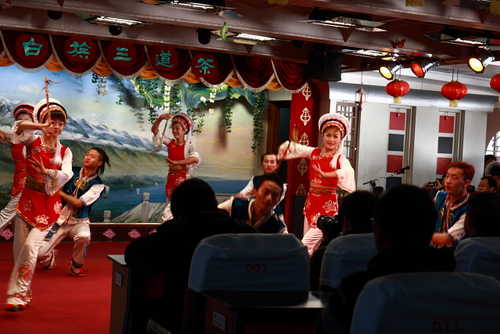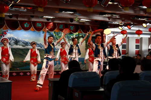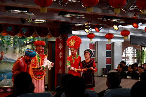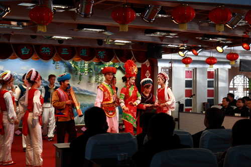 一邊欣賞節目還可品嘗白族的特色: 三道茶--一苦二甜三回味,是用來招待和考驗白族女婿