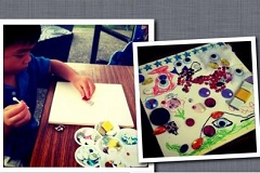 看看還在找寶石的Ariel,馬上也叫來吃東西,然後在下水踩一踩,果然,沒多久雨就毫不給情面的下下來了,把小孩從水裡叫上來,等了一下子雨沒變小的趨勢,所以轉戰去玩拼貼,孩子們各選了塊磚,然後又選了些漂亮的亮片、寶石、鈕扣、珠珠,就開心的黏貼起來了。