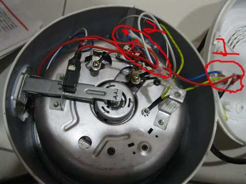 第三步、高手指點第二圈起來的部份,粗的白色塑膠線內藏'溫度及電流保險絲'壞了