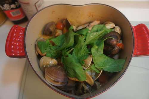 3.等到蛤仔大部份都開殼了,下九層塔,關火再悶個5分鐘,拌勻上桌