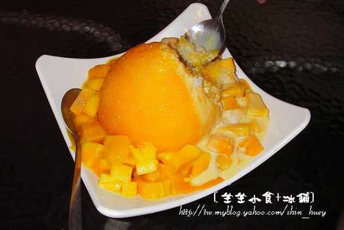 像座小山的剉冰外層淋滿芒果汁(醬),把雪白的冰包成金黃色,現切芒果很新鮮,也很甜,