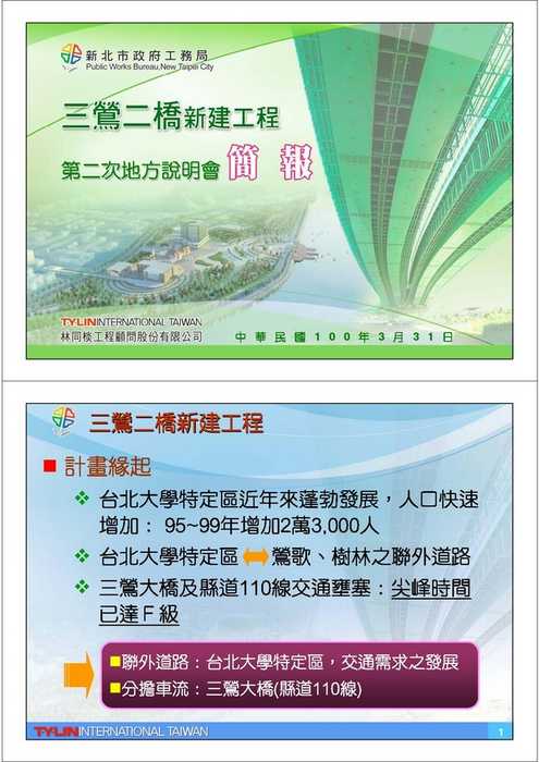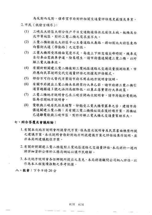 有關三鶯二橋新建工程,在今年3月31日有舉辦第二次地方說明會,以下提供當天會議紀錄及簡報資料給大家參考,目前本案尚未規劃當中,尚未完全定案,有任何意見都還可以跟交通局提出討論或要求改善。