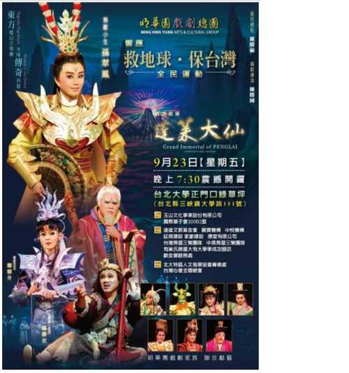 為了帶動全民對地球災變的認識,並響應聯合國搶救地球的呼籲;前副總統呂秀蓮特別邀請孫翠鳳率領響譽國際舞台的「明華園歌仔戲團」,在9月23日(五)晚上7點半~9點半,於台北大學三峽校區的綠草坪上演出,以呼籲大家響應「救地球保台灣」的全民運動。