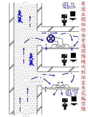 如果這個管道間填縫沒有做好,就像是一根煙囪,從中間破洞一樣,廢氣不會乖乖的從屋頂排出,就會從那些縫隙露出來,特別是屋頂風壓很大時,更會從中間漏風,所以如果你家樓下在浴室抽煙,剛好屋頂風壓又很大時,很可能煙味就會從你家竄出。