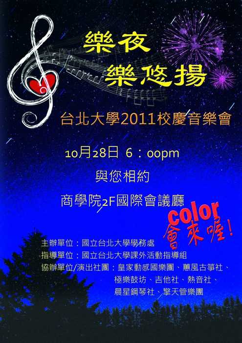 10/26~10/27中午在商院地下餐廳各社團有擺攤宣傳及獻上精彩表演做為暖身喜歡音樂的你千萬不要錯過囉!10/28晚上在商院國際會議廳國樂、管樂、古箏、熱音、鋼琴、吉他、極樂鼓坊七社聯合展演