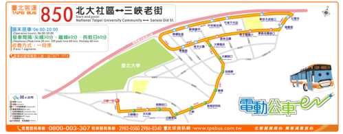 原2輛電動公車規劃配置於鶯歌經三峽到土城捷運永寧站的捷運先導公車,因電動公車於100年5月提前打造完成,故先行駛於850線公車,850線公車配合三峽地區民眾乘車需求,已於100年10月15日起調整為三峽區大勇路─文化路─民生路─三樹路─大義路─學勤路─大學路─樹林區學府路─佳園路3段─學勤路(返程由三峽區大義路─三樹路─民生街─文化路─大勇路),營運班次為一般日40班次、例假日30班次,採一段票收費,讓該二輛兼顧綠能、環保、無障礙等特性之電動公車能更符合民眾的需求,並提供市民更便利、更友善的大眾運輸環境。