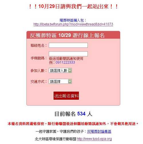 沒關係,不會報名就當天直接到集合地點搭遊覽車就好了,這只是方便行動聯盟的工作人員掌握人數及狀況,還是請大家儘量配合喔!拜託!