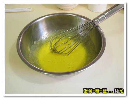 1.蛋黃加糖、鹽攪打