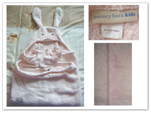1.二手粉色長耳朵兔子包巾(Pottery Barn Kids)--100元很可愛的一款包巾,適合剛出生的小Baby。邊緣有點染色(如照片)!美國帶回!長約60公分(含帽約80公分),寬約80公分