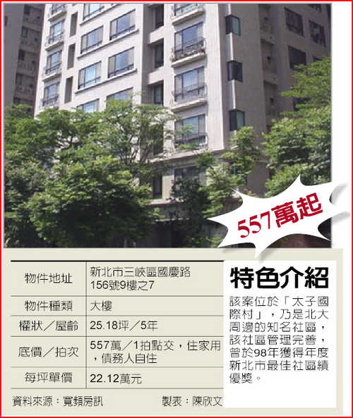 大台北房價漲不停,許多民眾紛紛向外圍移動,新北市外圍房市區域中,三峽地區因環境好、生活機能集中,讓房價仍屬親民的三峽地區成為許多民眾注目的焦點。寬頻房訊投資研究室推薦位於新北市三峽區國慶路156號9樓之7的大樓案件,目前1拍總底價557萬元,總坪數25.18坪,平均每坪單價為22.12萬元。