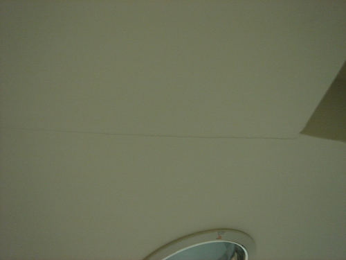 今天突然看到矽酸鈣板有一條裂痕(如圖),不過為了一個裂痕找師父好像沒必要,還有牆的油漆久了也會有裂痕。