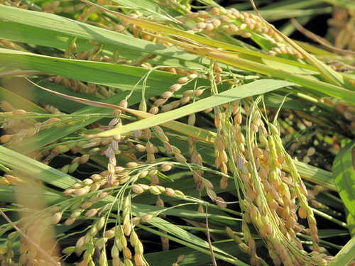夕陽將人影拉得好長,映在一大片金黃稻田