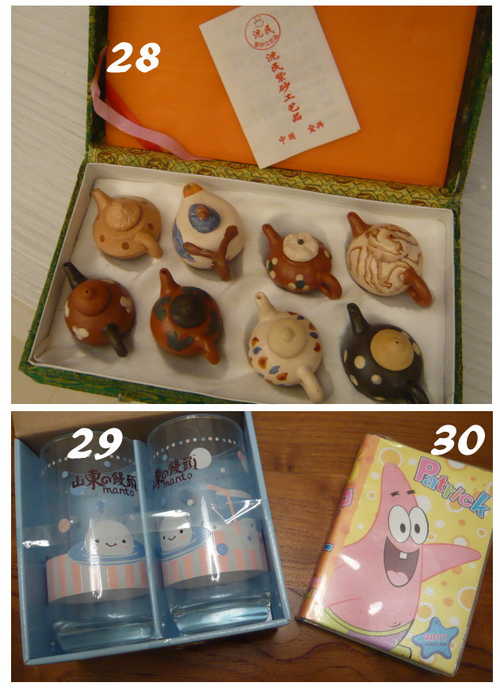28小茶壺擺飾,29玻璃杯2入,30派大星記事本2011(已過期可給小孩玩)