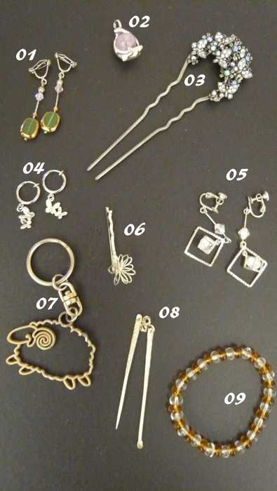 1.4.5夾式耳環,2項鍊墜子,3髮簪,6髮夾,7鑰匙圈,8耳挖+牙籤,9手環
