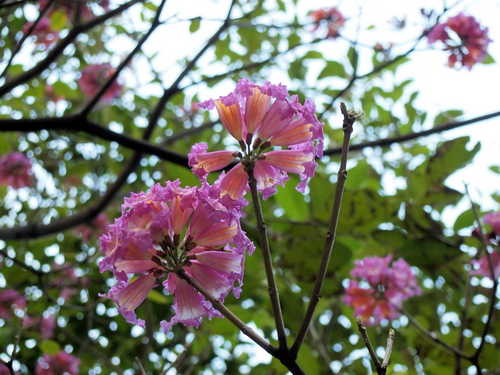 紫花風鈴木在冬末春初開花,花開時葉子會掉光,一眼望去只見褐枝綴滿紫紅花