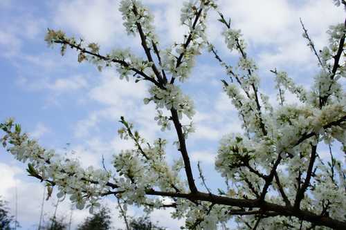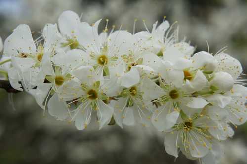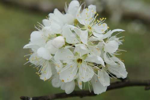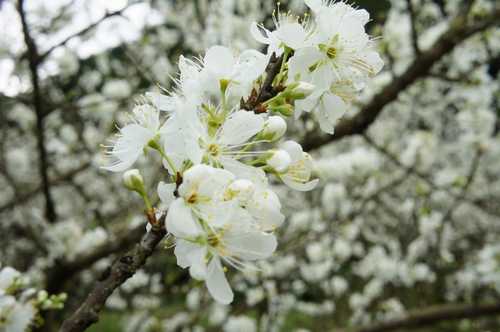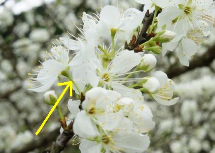 2. 李 -- 花朵由支幹分支腋生,多生 (就是有"梗"),雄蕊花絲細長而密,花藥呈黃或黃褐色