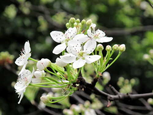 3. 梨 -- 花朵由支幹分支腋生,多生 (就是有"梗"),雄蕊花絲較短稀疏,花藥呈紅帶紫色