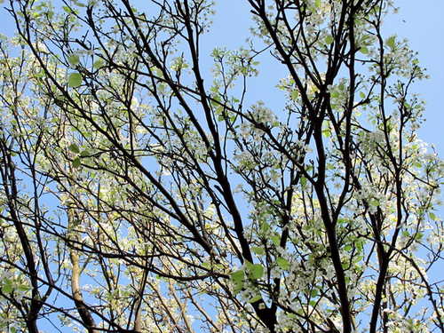 北大校園鳶園裡有好幾株梨樹,二月底三月初梨花盛開,花期維持約一個月就花落開始結果