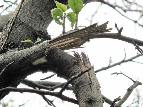 一枝斷裂的支幹呈三角形垂撐地面上,只剩一層薄薄樹皮與主幹相連