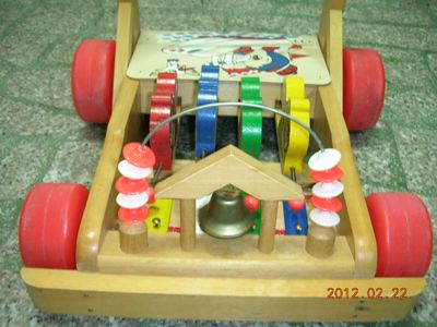 二手原木幼童學步推車,原木材質,幼童學步重心穩,不會跌倒,推動後會由木頭松鼠敲擊鐵片,產生聲音,引起幼童學習的興趣.350元