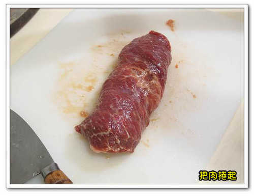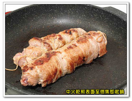 3.平底鍋中放少許油,將肉捲放入煎到表面變色