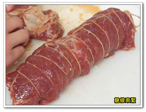 2.用棉繩將豬肉緊密捆扎成為肉捲