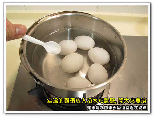 準備一鍋水,水要超過蛋的高度,加入3匙的鹽,