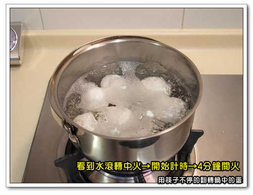水開始沸騰就開始計時,一邊計時一邊把蛋翻來翻去,避免蛋黃太靠近邊緣
