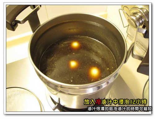 把蛋浸入冷的滷汁中,至少6小時(我都是浸一天)將蛋與滷汁冷藏