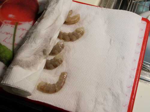蝦仁洗淨,放在廚房紙巾上吸乾水分~~ 吃起來的口感才會Q彈,不會粉粉的!!