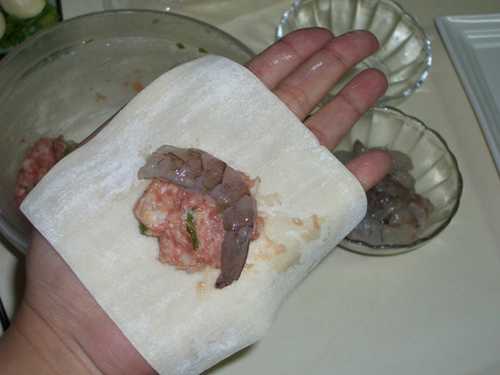 取一片餛飩皮,挖一小匙餡料,再把蝦仁放在餡料上~