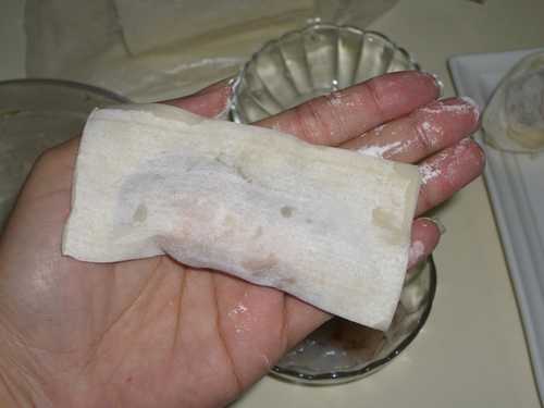 將餛飩皮的三周(ㄇ字型),沾上少量的水,並將下方的餛飩皮往上對折,形成長方形的形狀.