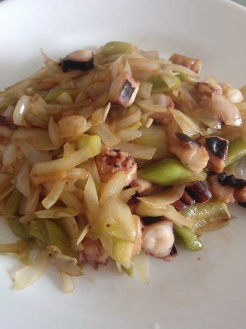 再將章魚丁放入鍋中炒到快熟,把蒜和洋蔥倒入混炒,