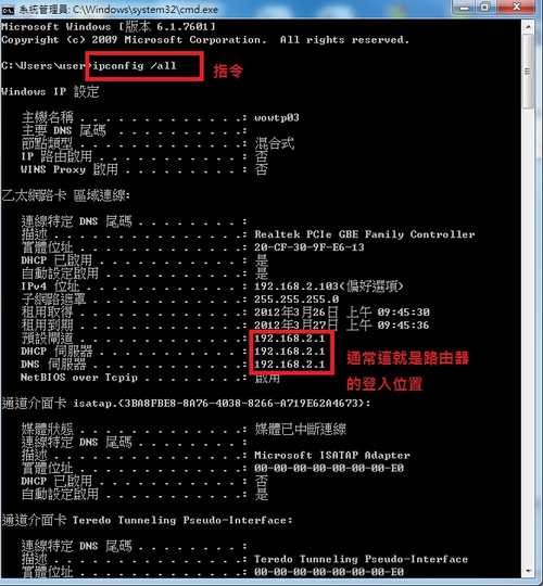 上面的 預設閘道 (Default Gateway) 通常就是你路由器的位置
