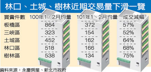 以樹林地區為例,永慶房屋根據新北市府公布的買賣移轉件數統計,去年1、2月樹林區平均單月交易量為538件,但今年同期只剩134件,只剩四分之一的交易量。