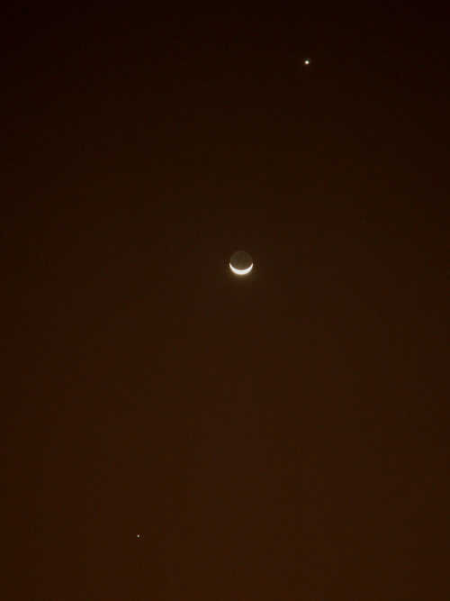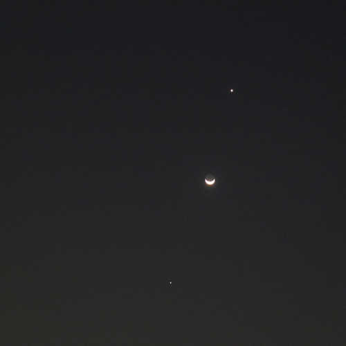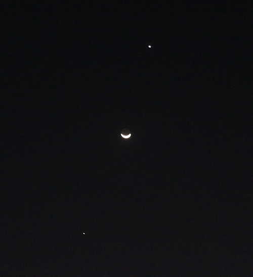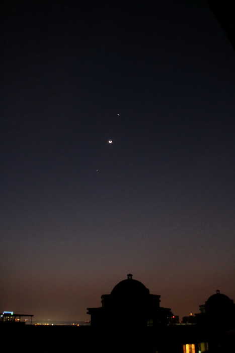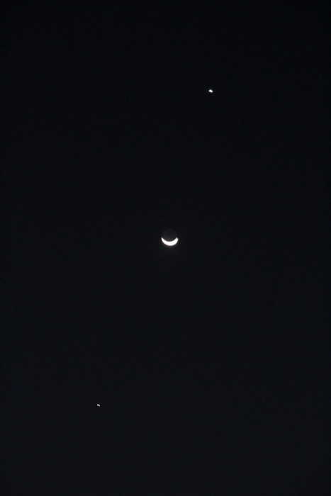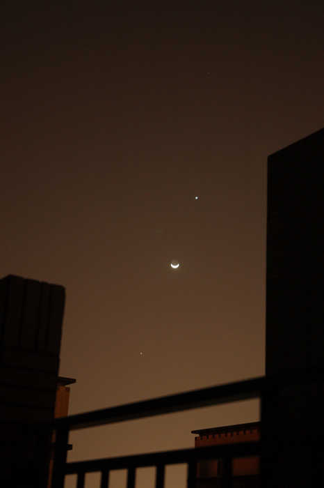 昨天與今天晚上都難得放晴, 加上今天看到新聞報導晚上有 "雙星拱月" 天文景象, 所以, 吃完晚餐之後, 就跑到頂樓拍下這個由上而下是 "金星+月球+木星" 的雙星拱月, 分享給大家囉!!