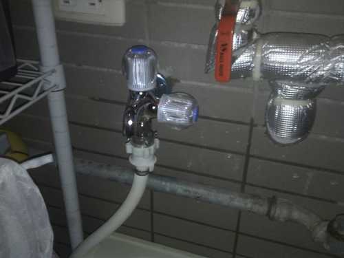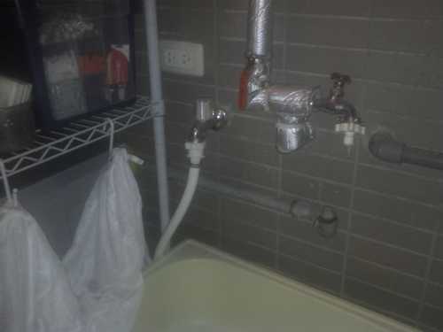 右手邊不是有一水龍頭嗎?何必要自找麻煩改呢? 那個是我熱泵連接的熱水龍頭,在會夏天時,使用熱水來洗衣服啦!