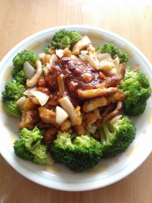 3.熱油,炒大蒜洋蔥,最後加入幾乎熟的炸花枝拌炒