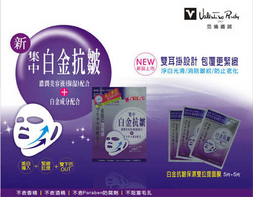 蘊含專利萃取技術的淡水湖藍藻,能平滑和緊實表皮,增加彈性,並減少平撫細紋,配合維他命B3.C誘導體,導入保濕成份,讓有效成分深入肌膚底層,發揮極致抗皺效能,明亮潤澤肌膚,白金成分減少肌膚產生乾燥暗沉,緊緻保水,配合雙耳掛布膜設計,360度緊密包覆全臉及拉提下巴,帶給肌膚更深層的滋潤,再造白金般耀眼無瑕肌