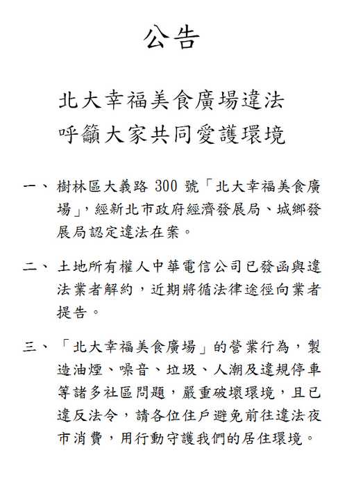 本人擬具簡易公告1份,呼籲大家下載印出後,交給社區管委會,請他們協助張貼宣導,也拜託大家幫忙呼籲親朋好友、左鄰右舍,請避免前往違法夜市消費,助長業者違法行為。