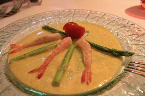 這是開胃菜...鮮蝦蘆筍!!(當然就是蘆筍+鮮蝦...底下黃黃的是加咖哩優格醬~~另外蝦殼已經幫你剝好了喔!!)