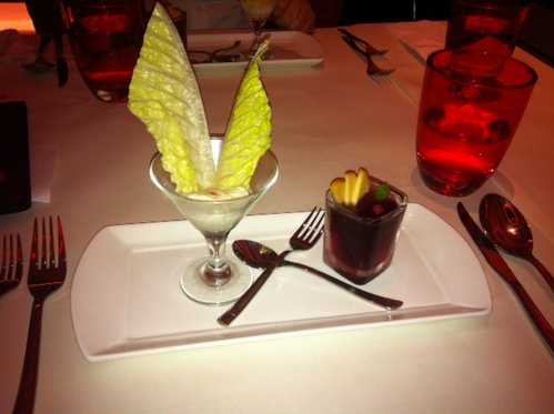 這是開胃雙重奏~~右邊的是酒凍(紅酒+萊姆汁~~+上面有放燻起司)左邊的是蘿美心+燻鮭魚塔塔醬...吃起來有種酸酸甜甜的感覺!!