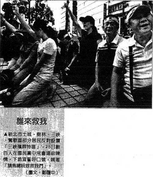 為反對新北市三峽設置殯葬特區,來自三峽、土城等上百名民眾昨天到中國國民黨中央黨部下跪陳情,要求總統馬英九出面救救他們。在黨部派人接下陳情書後,抗議活動平和落幕。