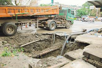 由於發生滲漏水的自來水管線埋設地下已30多年,且馬路經過拓寬後,管線位置就在人行道下方,增加開挖難度;工程人員先用機具移除路樹,還要避開淺層的各種管線,謹慎進行修復工程。