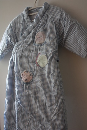 睡袍是日式的. 後面是魔鬼氈. 但是已經有點不黏了,介意的可找修改師傅換一條.