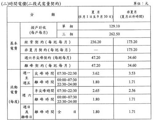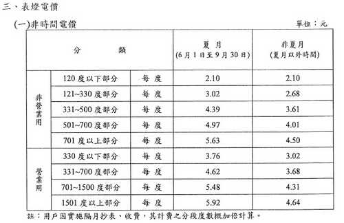 2.表燈非營業用電仍採目前之(1)110度以下;(2)111~330度;(3)331~500度;(4)501度以上,四個分段級距累進電價。表燈營業用電則採(1)330度以下;(2)331~500度;(3)501度以上,三個分段級距累進電價。