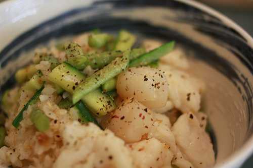 5. 待收汁,依序放入:鮮干貝,鮮魚,扁豆,小黃瓜,稍拌炒一下,悶熟即可起鍋.