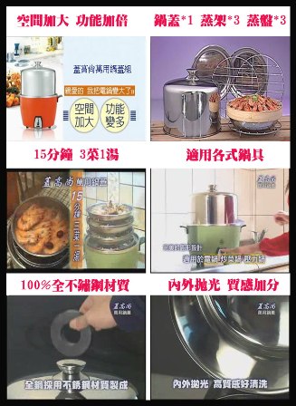 商品內容:鍋蓋*1、蒸架*3、蒸盤*3
