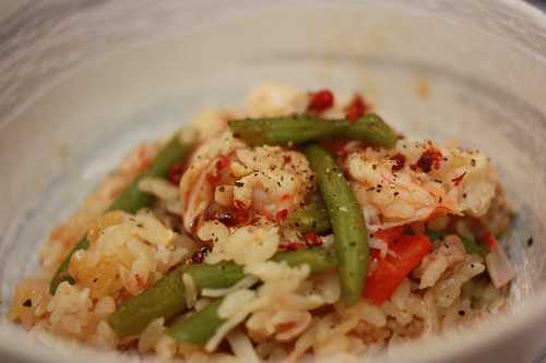 4. 飯粒收汁到8-9分熟,倒入蝦湯,一些番茄醬,以及鮮蝦(臭臭媽)